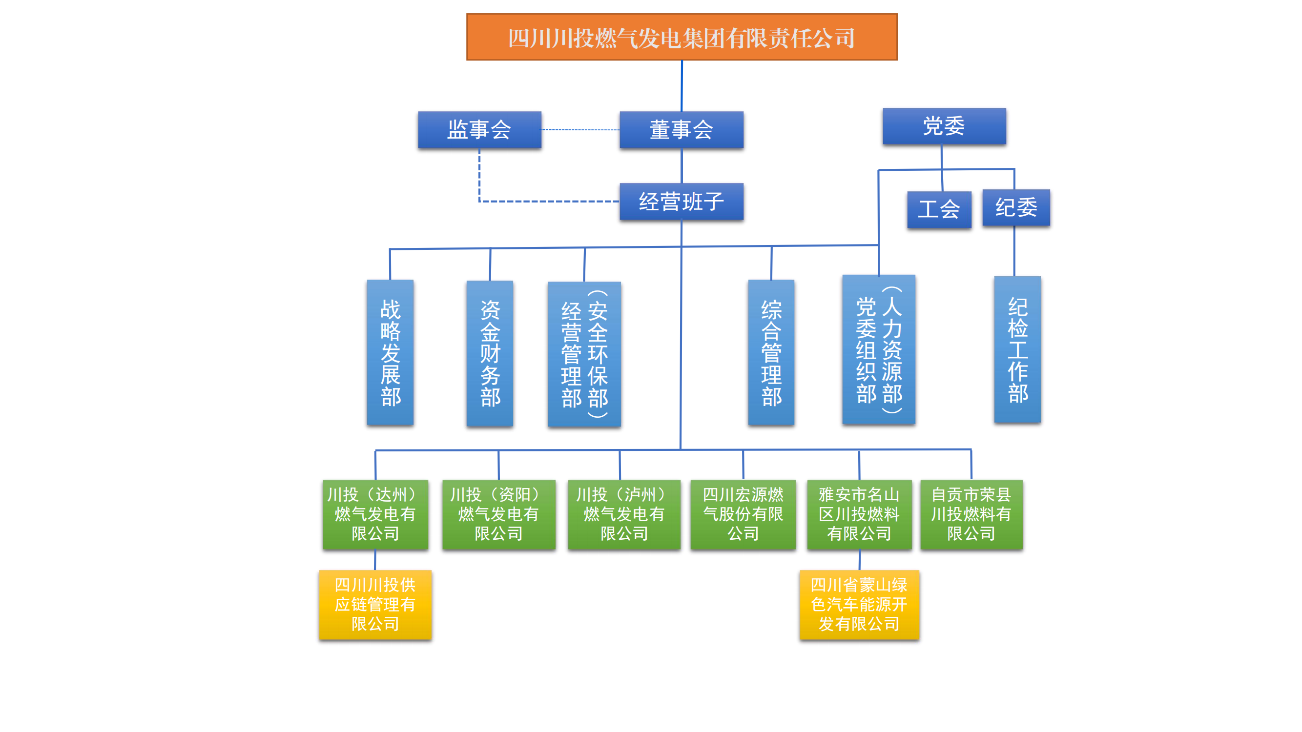 根据燃气发电产业整合及战略发展定位,按照“小总部、大产业”的集团型管控模式设置公司组织架构,四川川投燃气发电集团有限责任公司设立董事会、监事会,公司设立党委、纪委,同步设立党委组织部(人力资源部)、纪检工作部,经营层下设综合管理部、战略发展部、资金财务部、经营管理部(安全环保部)等4个职能部门。