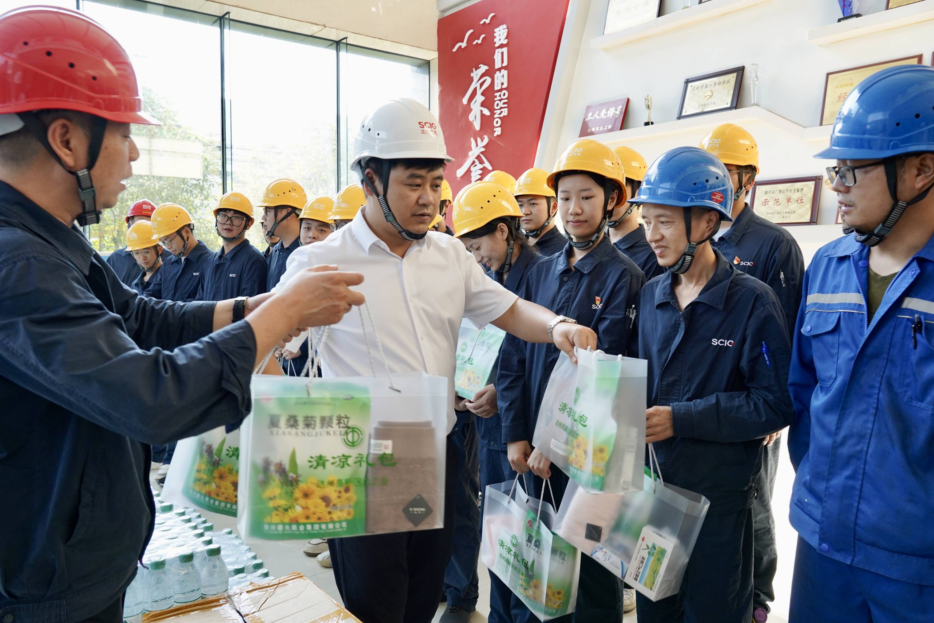 达州盛夏,烈日炎炎。8月1日,达州高新技术产业园区党工委专职副书记、总工会主席刘海波到达州气电一期生产现场,为坚守在高温酷暑下的电力生产一线职工送上“丝丝清凉”和“工会关怀”。达州气电党总支委员、职工董事、工会主席李勇陪同。