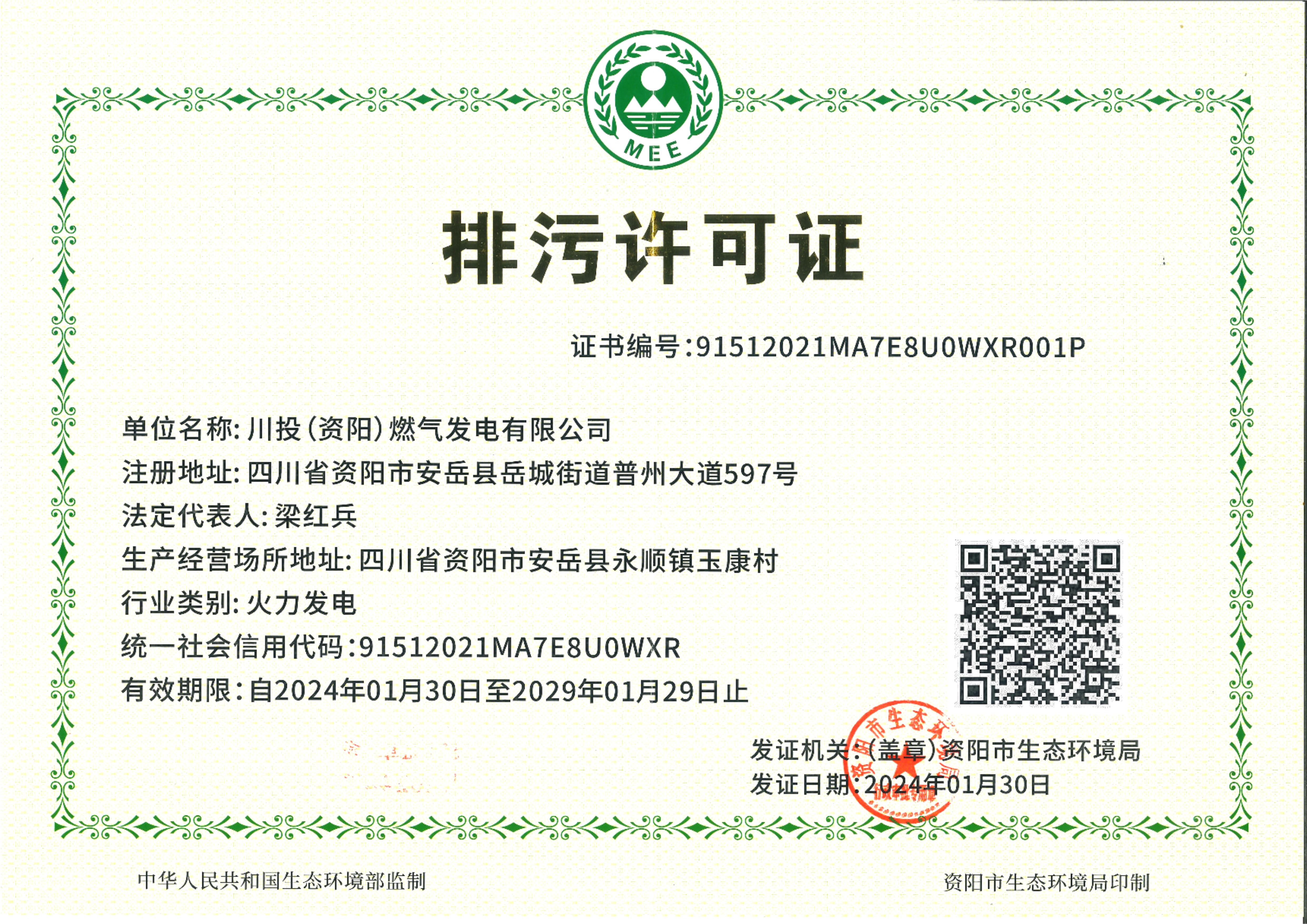 2024年1月30日,资阳燃气电站新建工程项目顺利取得资阳市生态环境局颁发的排污许可证。
