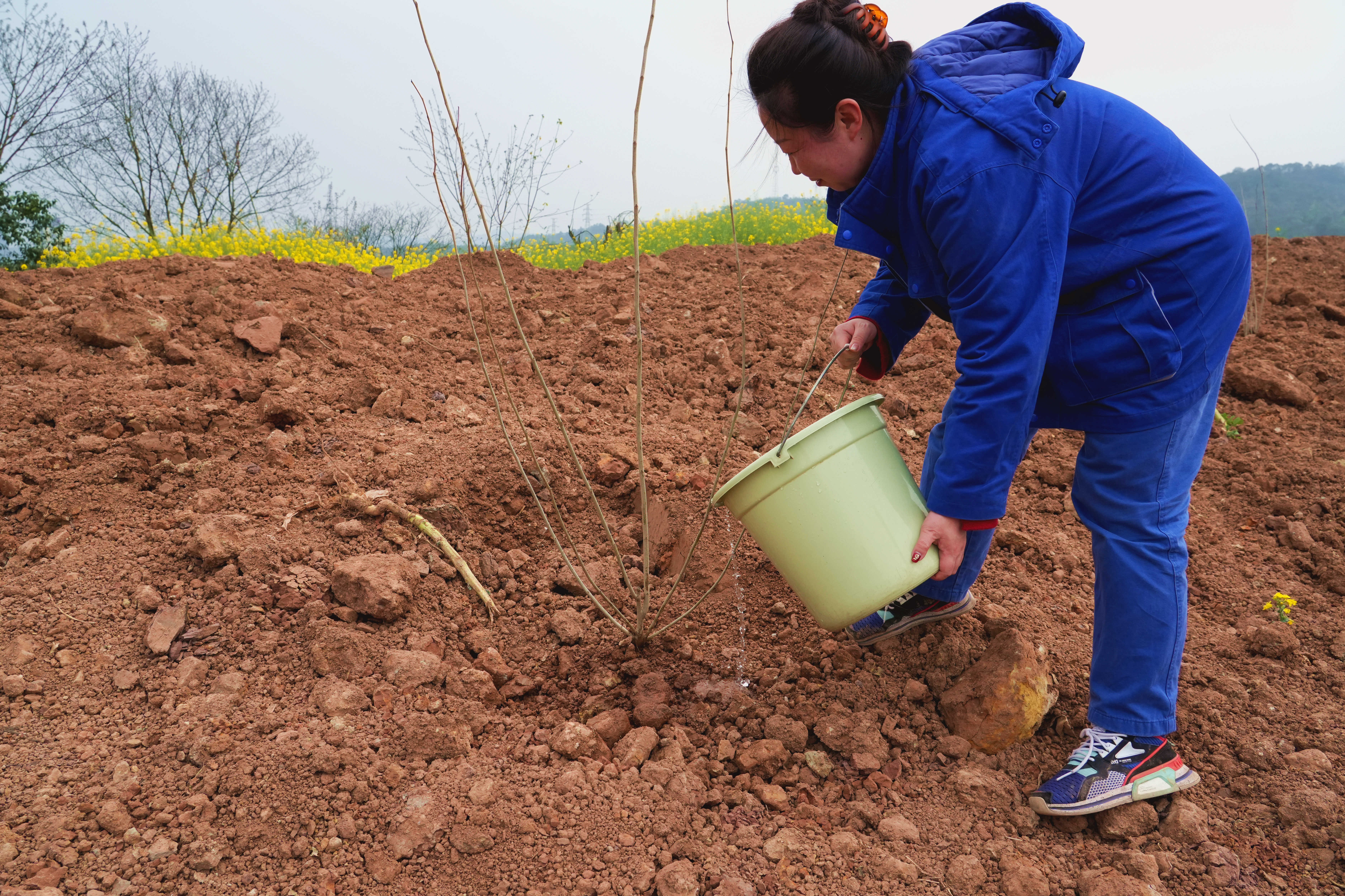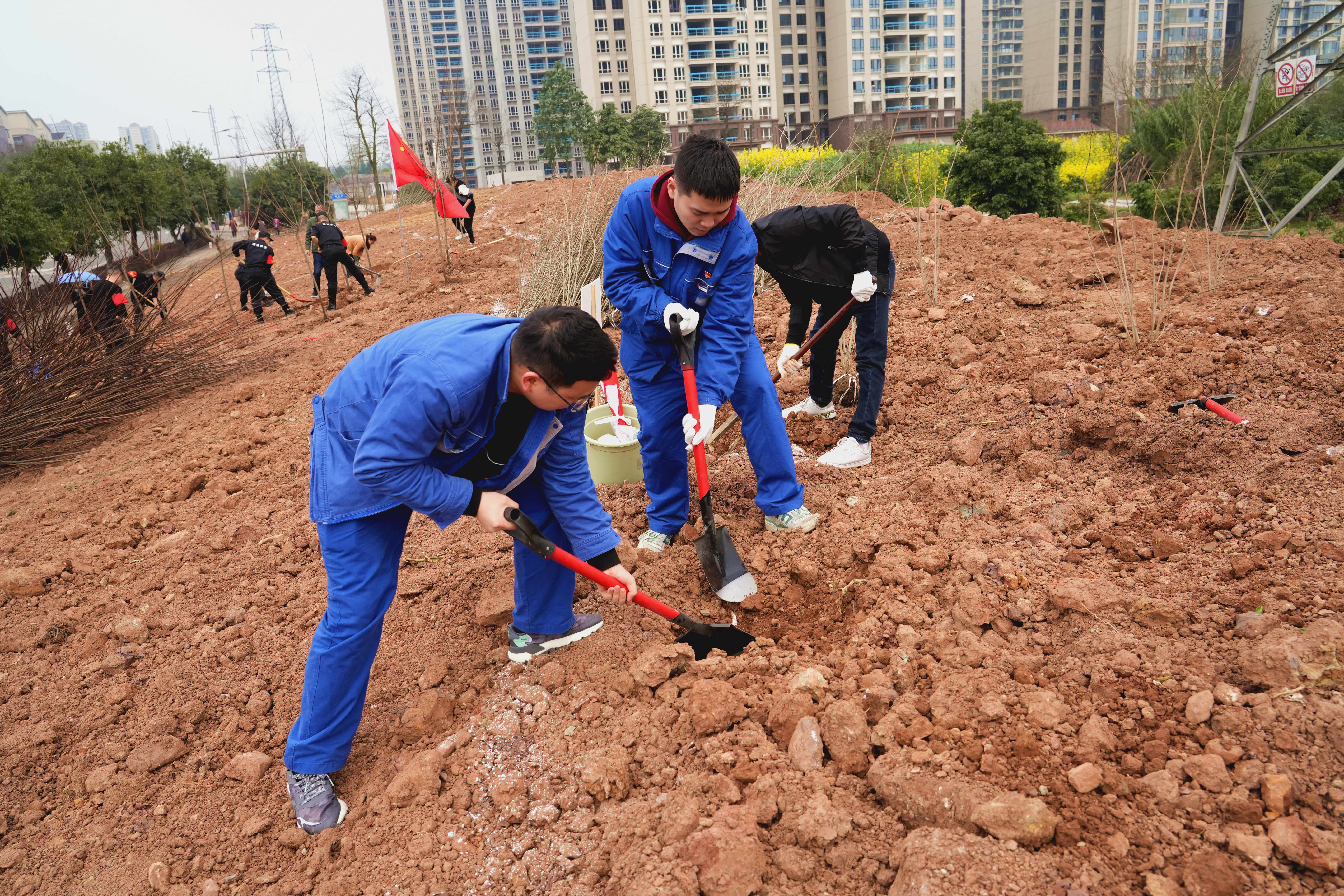 活动现场,志愿者们挥锹铲土、扶苗植树、提水浇灌,大家密切配合、干劲十足,在春日的阳光下尽情挥洒汗水,现场一派热火朝天的景象。经过大家的辛勤劳动,一棵棵树苗被栽下,一片片土地焕发新颜,大地上又增添了一抹新绿,孕育着勃勃生机。
